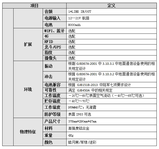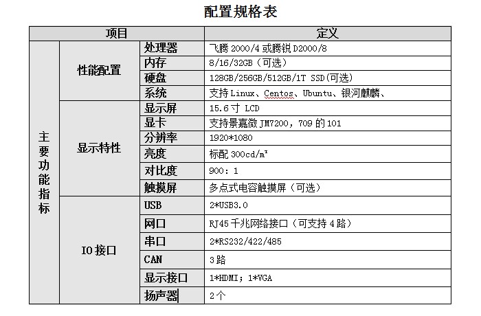 便攜式加固型計算機,處理器飛騰2000/4或騰銳D2000/8,內(nèi)存8/16/32GB(可選),硬盤128GB/256GB/512GB/1T SSD(可選),系統(tǒng)支持Linux、Centos、Ubuntu、銀河麒麟。顯示屏15.6寸 LCD,顯卡支持景嘉微JM7200,709的101,分辨率1920*1080,亮度標配300cd/m2,對比度900:1,觸摸屏多點式電容觸摸屏(可選)。