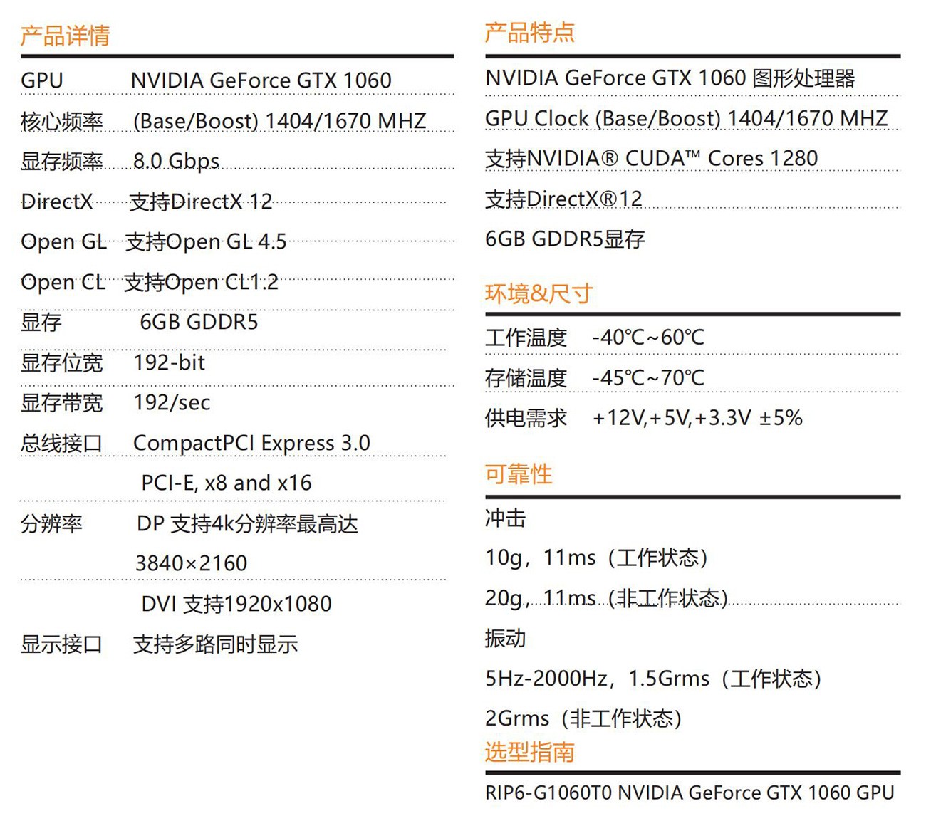 一款CPCI-E獨立顯卡,采用NVIDIA GeForce GTX 1060圖形芯片, 顯存時鐘為8.0 GBPS為192Bit 6G GDDR5顯存 支持Open GL 4.5支持 DirectX 12支持Open CL 1.2支持NVIDIA? CUDA? Cores 1280 等技術(shù);具有出色多顯示輸出接口、該產(chǎn)品有良好計算和圖形性能,適合高性能的應用場合,這使得顯示模塊能夠應對最復雜的并行應用程序,比如地形 繪圖雷達導航和氣象繪圖,面部和手勢識別,以及生物識別分析等。